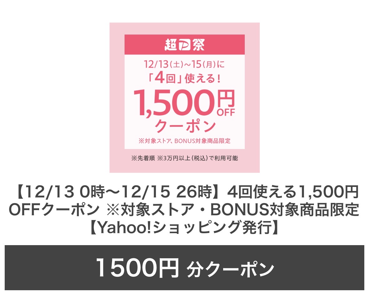 Yahooショッピングで4回使える1,500円オフクーポンが配布されています。